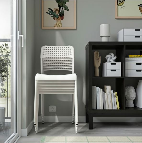 Light, airy and stackable. This chair is perfect as an extra seat when you have a lot of guests around the table and is also easy to store away when you want to clean, dance or just need more floorspace.