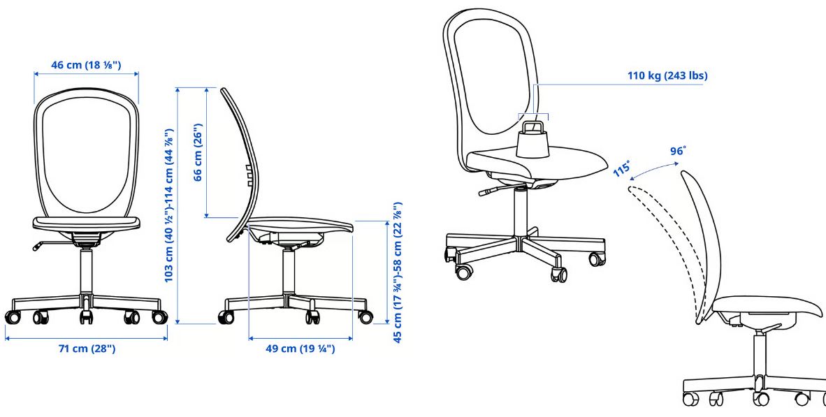 Height-adjustable seat allows you to adjust the height so that back and legs are at a 90° angle.