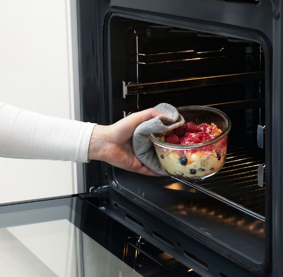 The food container is made of oven-safe glass and can be used as an oven/serving dish.