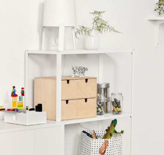 You can fill the shelves with different storage boxes in order to adapt the space to what you store and make the look of the bookcase more personal.