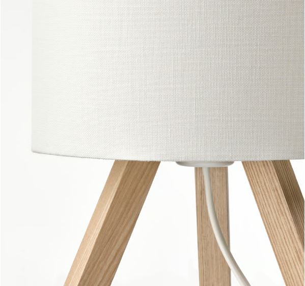 A blonde-coloured tripod with legs in solid ash that spreads a soft mood light through its white textile shade. Small, neat and easy to place. Maybe by the bed, on a chest of drawers or on a shelf?